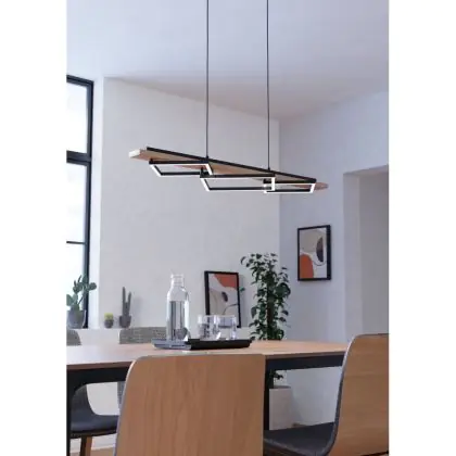 Die Eglo Pendelleuchte Boyal Holz Schwarz, Braun 42W 3500lm - 830 Warmweiß | Dimmbar sorgt für eine angenehme Ausleuchtung und punktet durch modernes Design. Diese Leuchte ist speziell zur Montage an der Decke vorgesehen.