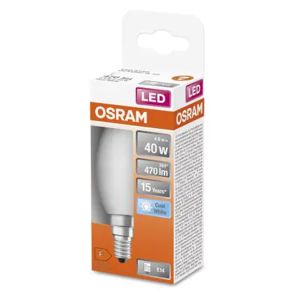 Die Osram LED Star Classic E14 Kerze Matt 4.9W 470lm - 840 Kaltweiß | Ersatz Für 40W ist eine effiziente E14 LED-Lampe und der perfekte Ersatz für Ihre konventionellen 40W Lampen mit E14-Sockel. Zudem strahlt sie Licht in der Farbtemperatur 4000K - Kaltweiß aus und punktet durch eine lange Lebensdauer.