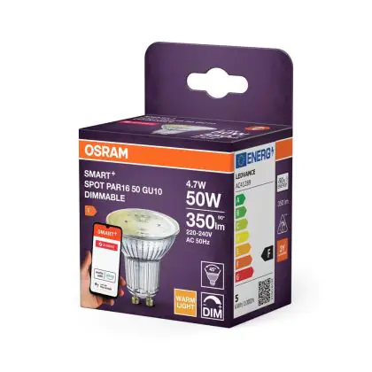 Die Osram Smart+ Spot LED Reflektor GU10 PAR16 4.7W 350lm 45d - 827 Extra Warmweiß | Zigbee Dimmbar - Ersatz Für 35W ist eine effiziente GU10 LED-Lampe und der perfekte Ersatz für Ihre konventionelle Halogenlampe mit 35W und einem GU10-Sockel, bei welchem die zwei Stifte einen Abstand von 10 mm zueinander haben. Zudem strahlt das Produkt Licht in der Farbtemperatur aus und punktet durch eine lange Lebensdauer.